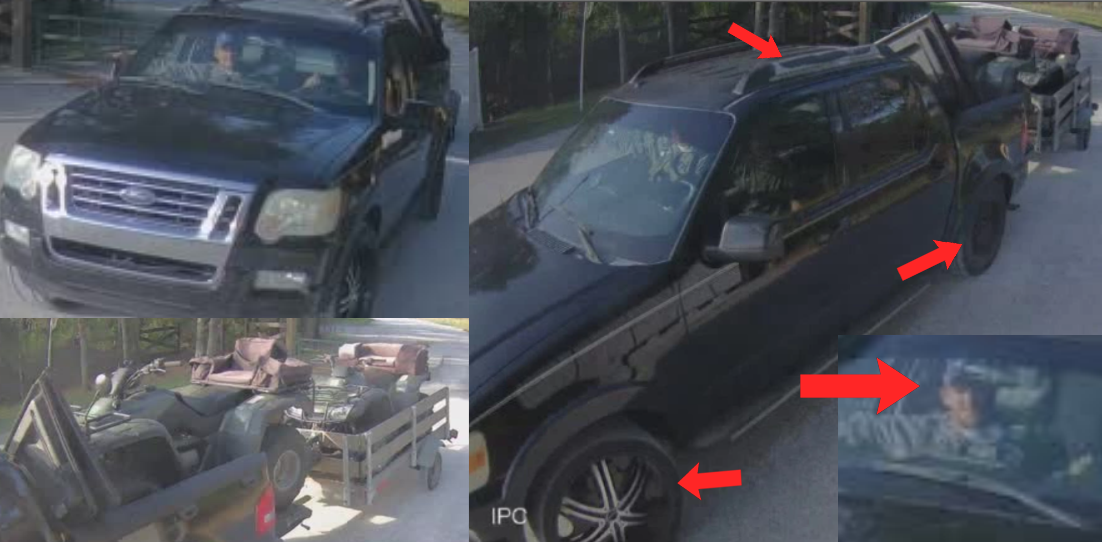 The theft was captured on security video and shows at least two suspects in the cab of what appears to be a dark-colored Ford Sport Trac quad cab (maybe a 2007-2010 model).
