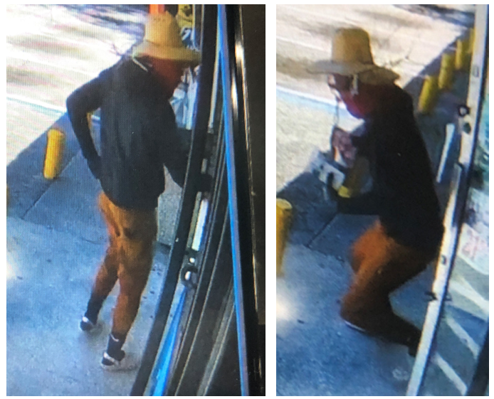 The suspect is described as a black male measuring about 5'11". He was wearing a red bandana, straw hat, gray gloves, and multi-colored Crocs. For unknown reasons, he was also holding small tree branches.