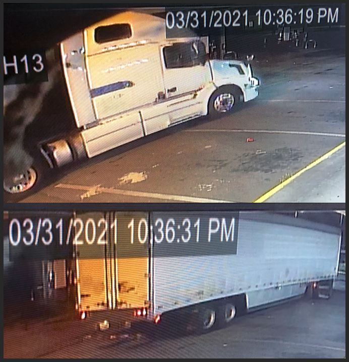 This white semi tractor and trailer (53' refrigerator unit) came to the location and stayed there for about 15 minutes. During that time, more than 100 gallons of fuel were stolen.